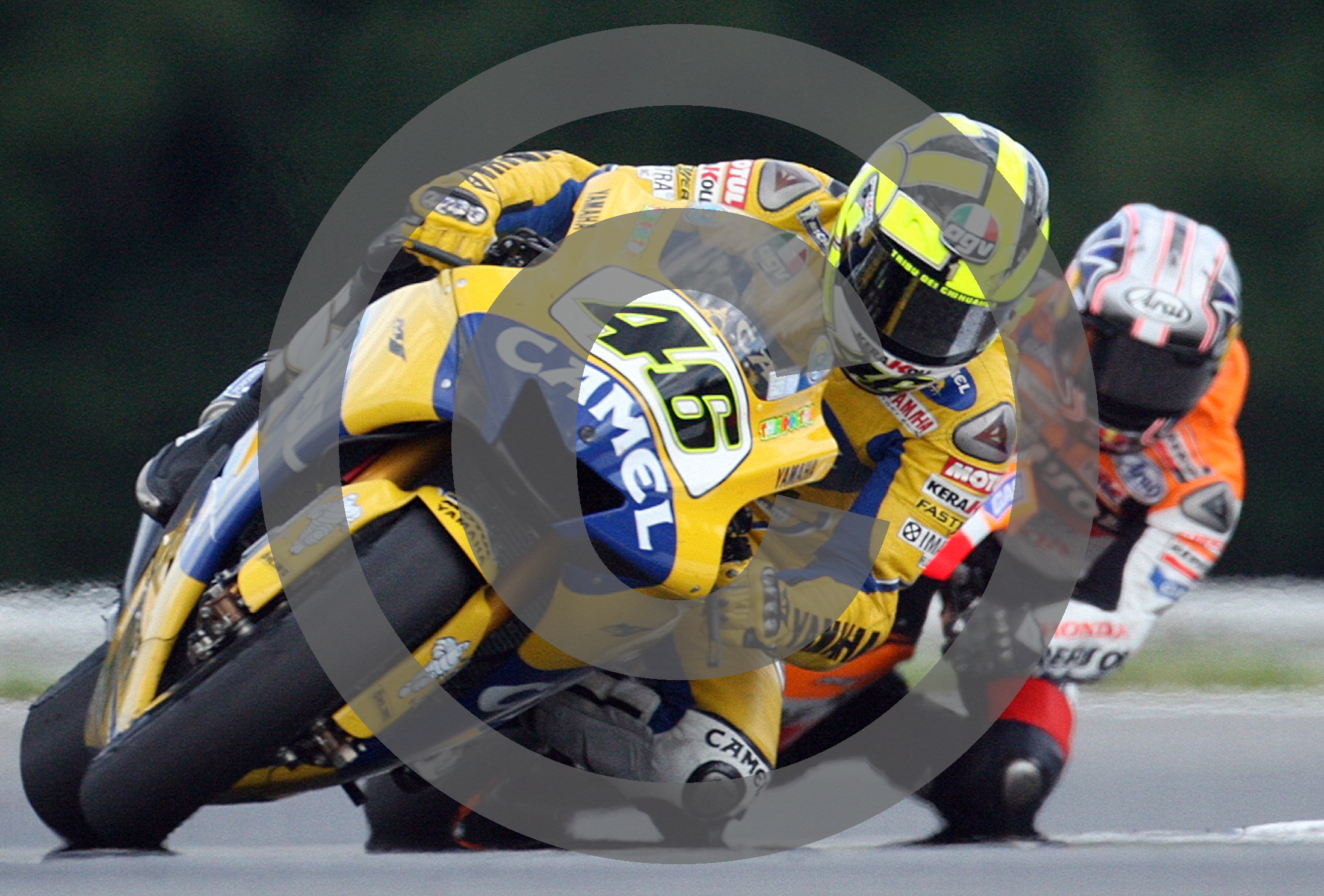 Caption:Yamaha MotoGP rider Valentino Rossi of Italy is followed by Honda rider Dani Pedrosa of Spain during the Czech motorcycling Grand Prix at Masaryk's circuit in Brno August 20, 2006. REUTERS/Heinz-Peter Bader (CZECH REPUBLIC)